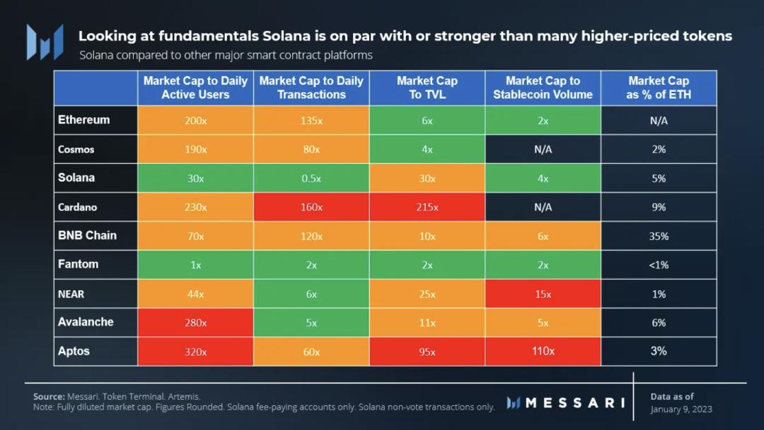 将 Solana 的关键指标与其他主要 L1 进行比较,许多途径的基本面和价格之间存在很大差异。在评估活跃用户数量、交易量和稳定币数量时,Solana 的市值远低于竞争对手。