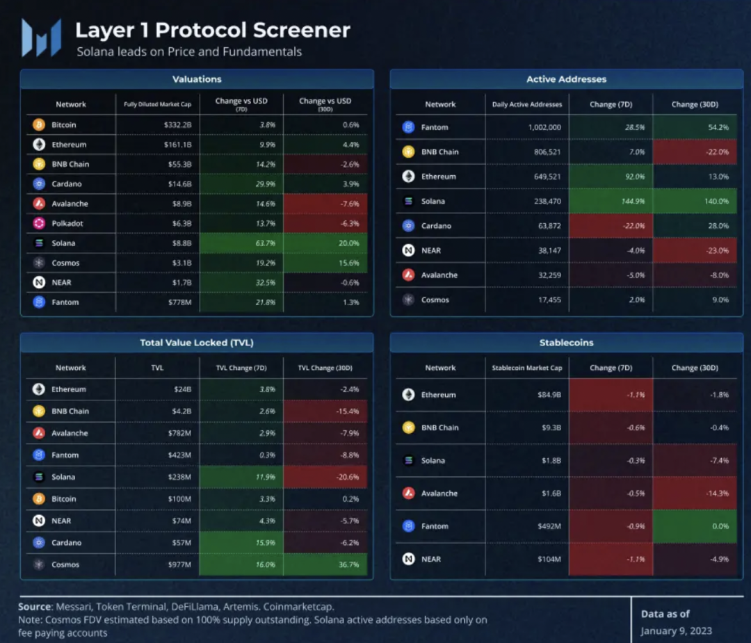 虽然毫无疑问 FTX/Alameda 是整个 Solana 生态系统的总价值锁定(TVL)、交易和代币价值的支撑,但它们只是更广泛生态中的一小部分。 Solana 生态系统仍然拥有构建者网络、应用程序生态系统和大量资金,与几乎任何其他 L1 一样强大。随着投资者在圣诞节假期后重新发现基本面,Solana 在这些驱动因素的支持下强劲反弹。