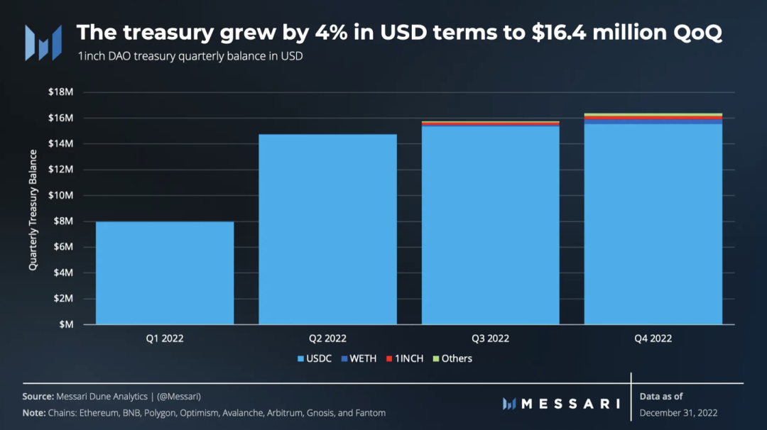 随着第 3 季度 1IP-09 的实施,财政部现在在其价格低于 1.30 美元时积累 1INCH 代币。由于 1INCH 在 2022 年下半年的交易价格一直低于 1.30 美元,因此 296,000 个 1INCH 代币在第四季度被添加到财政部,价值 249,000 美元。此外,在第四季度,价值 260,000 美元的 226 WETH 和 USDC、DAI 和 USDT 中的 298,000 美元被添加到国库中。按美元计算,国债余额环比增长 4%,同比增长 268%,年末余额达到 1640 万美元。