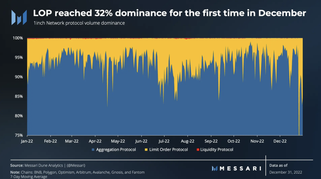 在第四季度,FTX 事件蔓延将用户行为转向了Aggregation Protocol (AP)。 AP 交易量环比保持相对稳定 (-0.61%),但由于更多用户寻求紧急执行市场订单,限价订单协议 (LOP) 的交易量下降了 33%。然而,随着市场跌至 2021 年第一季度的低点,LOP 的主导地位在 12 月底大幅增长。 LOP 交易量的增加可能是由于用户设置了有利的限价订单并预期即将触底。