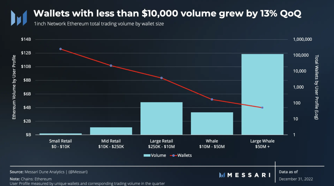 以太坊的整体交易量环比下降。然而,在第四季度,中小型散户钱包配置文件分别增长了 13% 和 8%。除了散户钱包的增长外,它们的相应数量分别增长了 10% 和 3%。 1inch 的交易量呈明显的幂律分布,一小部分钱包占据了绝大多数交易量。中小型散户和活动的增长是零售用户将 1inch 视为生态系统中强大平台的强烈信号。