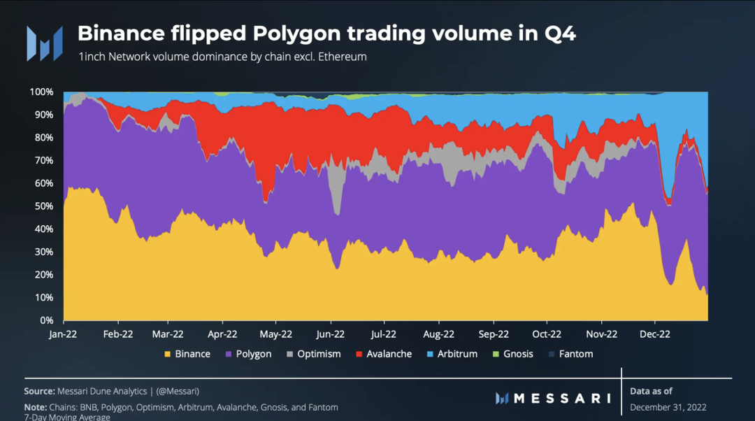 平均而言,以太坊在 2022 年拥有约 86% 的总交易量市场份额。这一趋势将在 2023 年继续;然而,自 Arbitrum 推出以来,1inch 的使用量一直在急剧增长。自今年年初以来,Arbitrum交易量的主导地位增长了两位数,很可能会威胁到 Polygon 和 BNB Chain 在 2023 年的地位。增长归因于网络使用量的增加,即 DeFi 的总体使用量,也可能是由于对 Arbitrum 空投的持续猜测。时间会证明这种增长是否会持续。