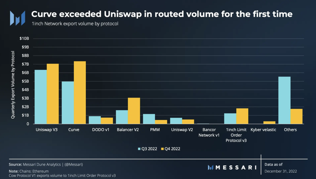 1inch Network 的主要目标是使用其 Pathfinder 算法通过各种协议促进最有效的贸易路由。在第四季度,Curve 的交易量首次超过了 Uniswap。第四季度出口额从 225 亿美元增长 2.6% 至 231 亿美元。 Uniswap、Curve、Balancer 和 CoW 在前期的交易量有所增加,但仍比第二季度大幅下降,总量同比下降 51%。
