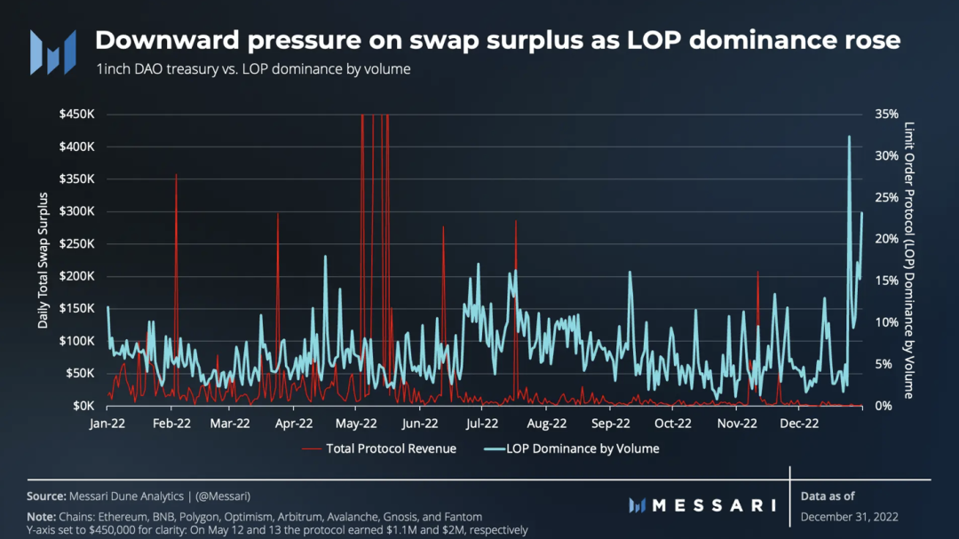 Swap Surplus(即 1inch DAO Treasury 的收入)是 AP 上代币掉期的正滑点的结果。在 FTX 崩盘导致波动之后,1inch DAO Treasury 的协议收入在 11 月中旬飙升。在此期间,AP 的交易量飙升,加上混乱的市场,使 AP 获得了掉期盈余,这是财政部的净收益。随着市场在 FTX 崩溃后经历新低,波动性似乎稳定下来,LOP 的主导地位达到新高。这种主导地位的增加使用户受益,因为他们可以确保战略价格执行。但是,在 LOP 上交易时不会捕获掉期盈余,这会阻止 1inch DAO Treasury 产生额外的协议收入。