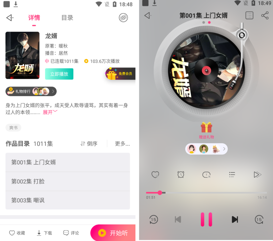 首页是一些精品的听书资源,分类也很多:无损、多播、穿越、霸总、虐心、热血、轻松,基本想看的都应有尽有。