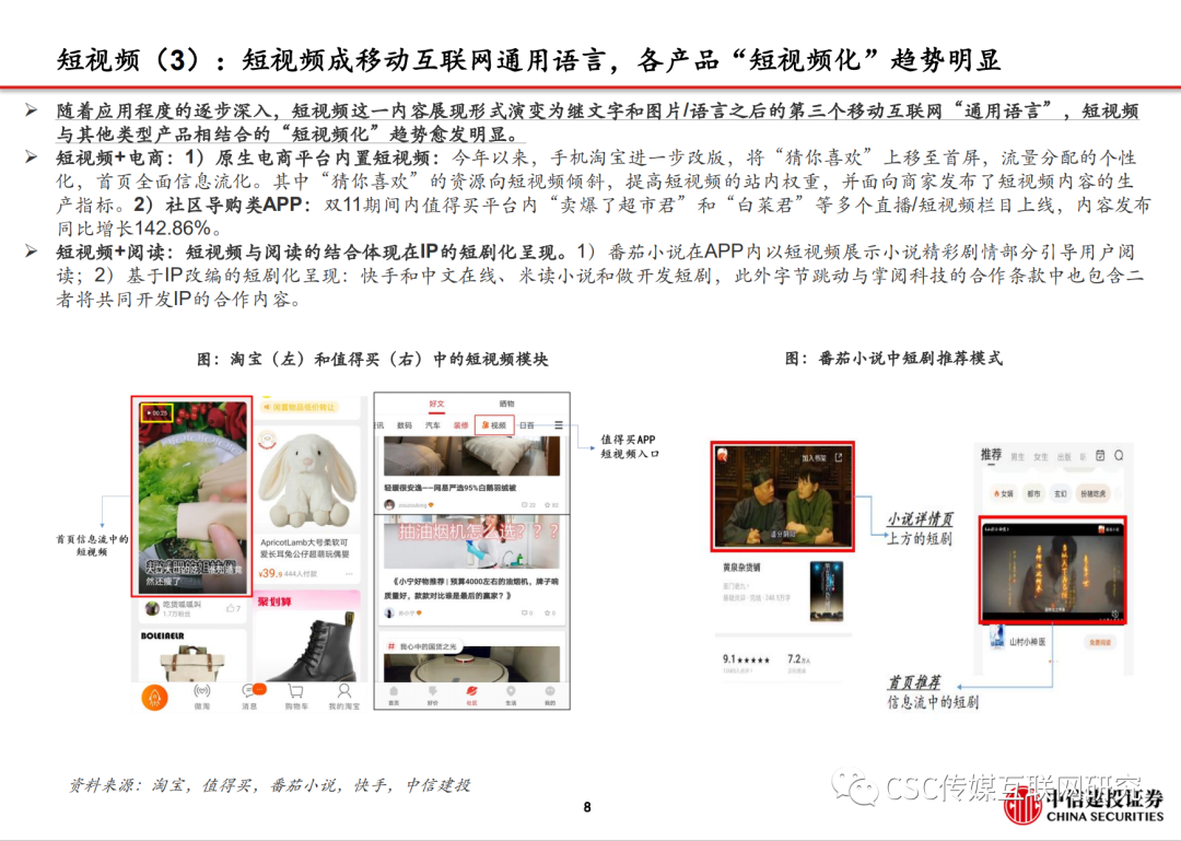 ➢短视频自诞生以来,以其碎片化、娱乐化和高沉浸度的特点快速占据用户使用时长,据QuestMobile,2020年12月短视频月人均使用时长依然保持近40%的同比增长,成为少数在移动互联网流量红利见顶期仍能实现增长的赛道,随着应用程度的逐步深入,短视频这一内容展现形式演变为继文字和图片/语音之后的第三个移动互联网“通用语言”,与其他产品相结合的“短视频化”趋势愈发明显,如电商、阅读和社交,短视频也成为4G移动互联网下内容的终极展现形态和出口。