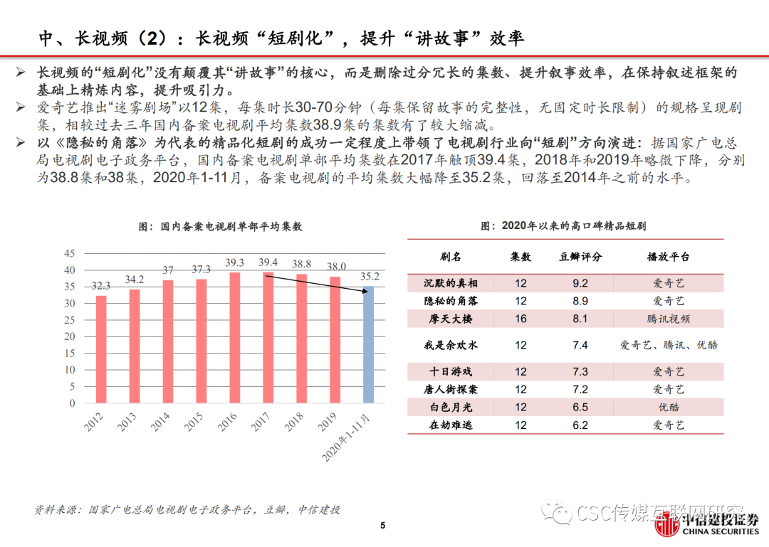 ➢长视频以叙述故事为主,相对短视频“开篇即高潮”的体验,长视频需要较多的铺陈并娓娓道来,因此能与观众建立更为深度的情感联结,观看长视频实际是解决观众深度的情感、价值需求,用户此类需求刚性且持久,根据QuestMobile,2020年12月,在线视频行业渗透率为75.1%,仅次于短视频的75.2%,在使用时长方面,长视频的使用时长稳定,平均月使用13.8小时,在短视频、游戏等其他泛娱乐内容的时长竞争下依然保持了较好的韧性和时长的绝对规模。