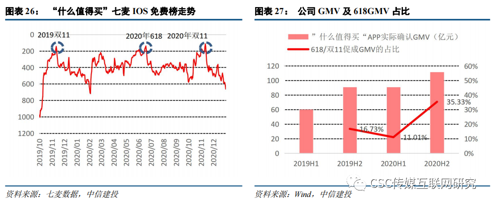 改版后的首个618,比价服务有望为公司带来新的用户增量和GMV增量。从七麦IOS免费榜来看,过去每个促销季都会给“什么值得买”APP带来一波用户量的提升。预计此次618大促也会提升用户量,2020年上半年,值得买平台导向电商及品牌商的净交易额(确认GMV)为90.99亿元。而2020年“618”大促当天,净交易额(确认GMV)达10.02亿元,占2020年上半年实际确认GMV的11.01%。改版后的APP加入了更加生动有趣的视频内容和更加专业活跃的社区创作,提升了比价效率和用户体验。据投资者交流会分享,改版后的数据呈现出老用户对新版本越来越适应,新用户的浏览时长、访问页面数量、电商转化率都有较为明显的提升,我们认为大促带来的新增用户会有更显著的留存。