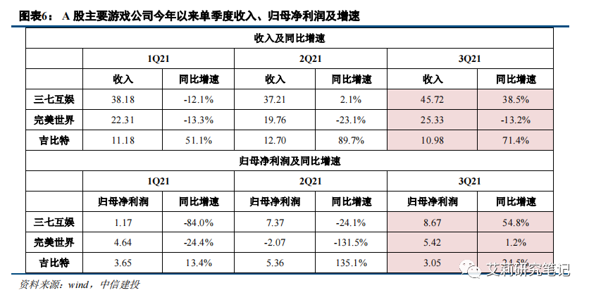 今年以来,A股主要游戏公司(主要是完美世界与三七互娱)在Q1、Q2因新品上线节奏、海外项目计提损失等一系列原因,上半年收入、归母净利润的同比增速有一定程度下滑,但从Q3开始,前期的压制因素基本解除,产品节奏回归正常,Q3收入与净利润端在环比与同比方面均有显著改善。