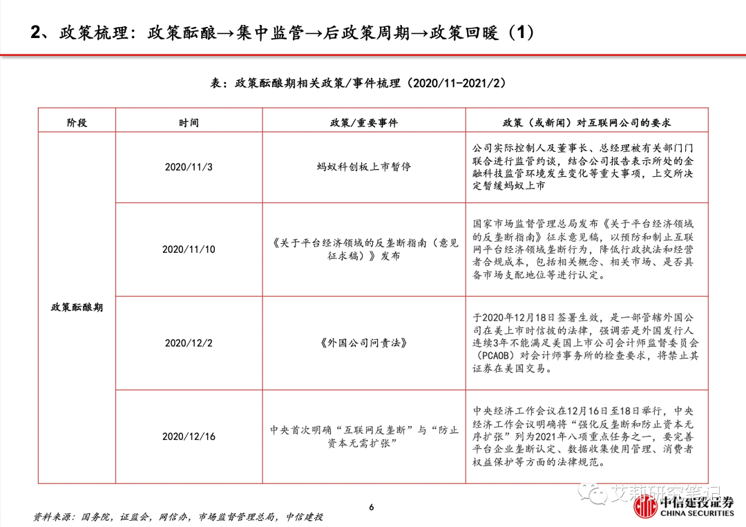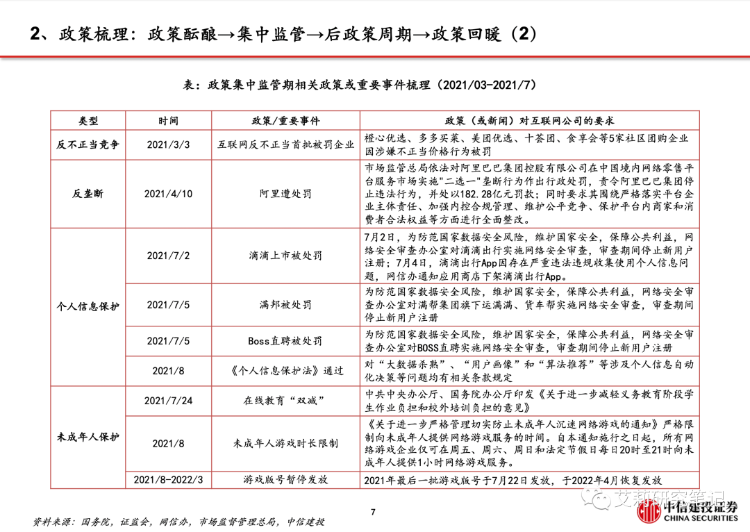 1)本轮互联网监管自2020年11月开始酝酿,21年3月-7月进入集中监管。期间数个政策与处罚并发,涉及反不正当竞争、反垄断、用户数据安全、未成年人保护等多个主线。