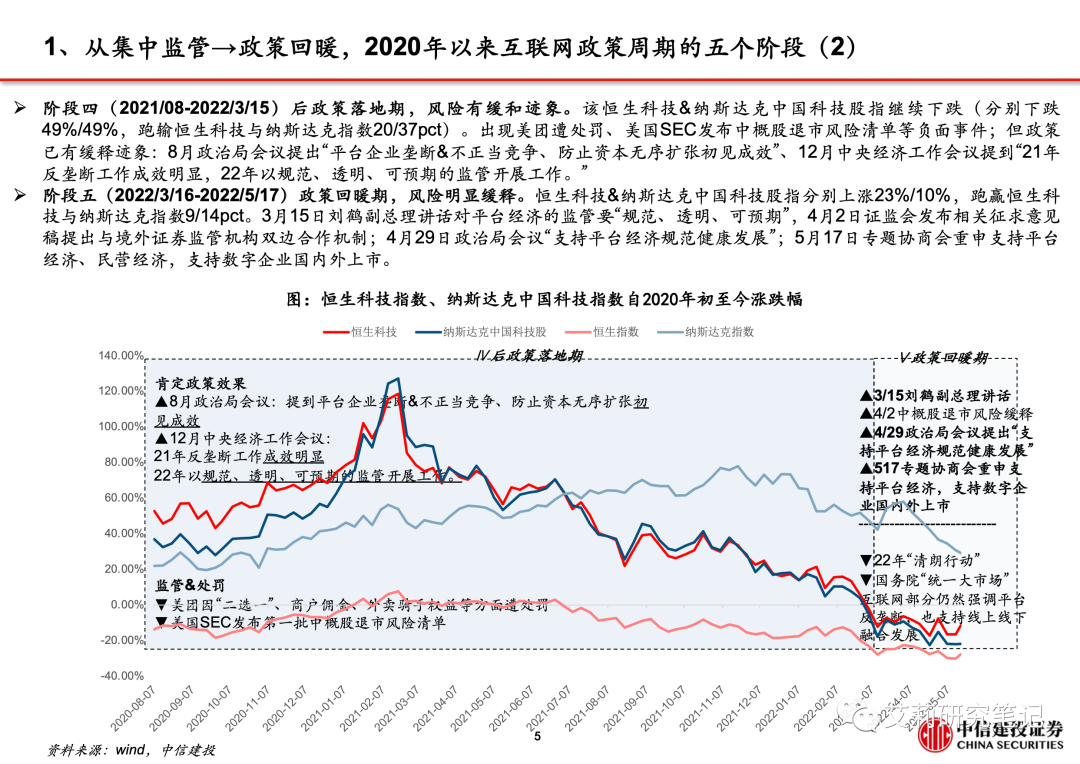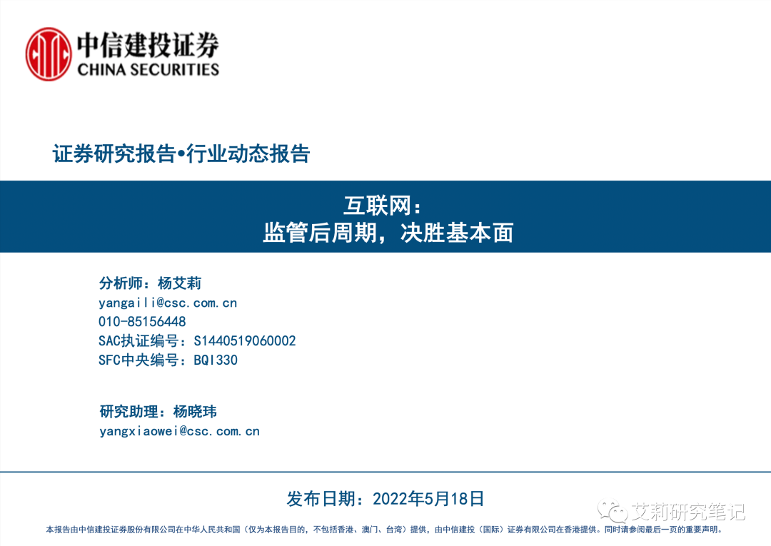 2)21年8月以来风险已有缓释迹象,4/29与5/17会议进一步缓释政策风险。21年8月政治局会议提“垄断&不正当竞争、防止资本无序扩张初见成效”;21年12月中央经济工作会提“反垄断工作成效明显”;22年3月15日刘鹤副总理提对平台经济的监管“规范、透明、可预期”。4月29日与5月17日两次会议又从更高的层次重申支持平台经济。