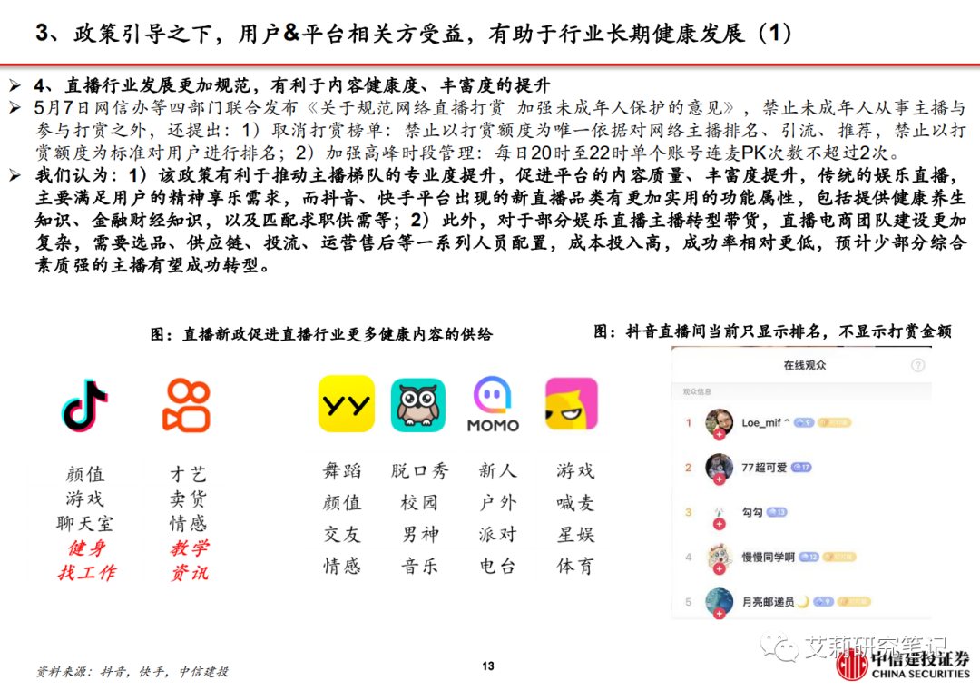 3)常态化监管可期,支持发展的主旋律不变。前期已处于征求意见或小范围试行的政策陆续落地(如5月网信办发布直播行业新政),其目的仍然是规范行业健康发展,总体上支持平台经济健康发展主旋律得到确认。