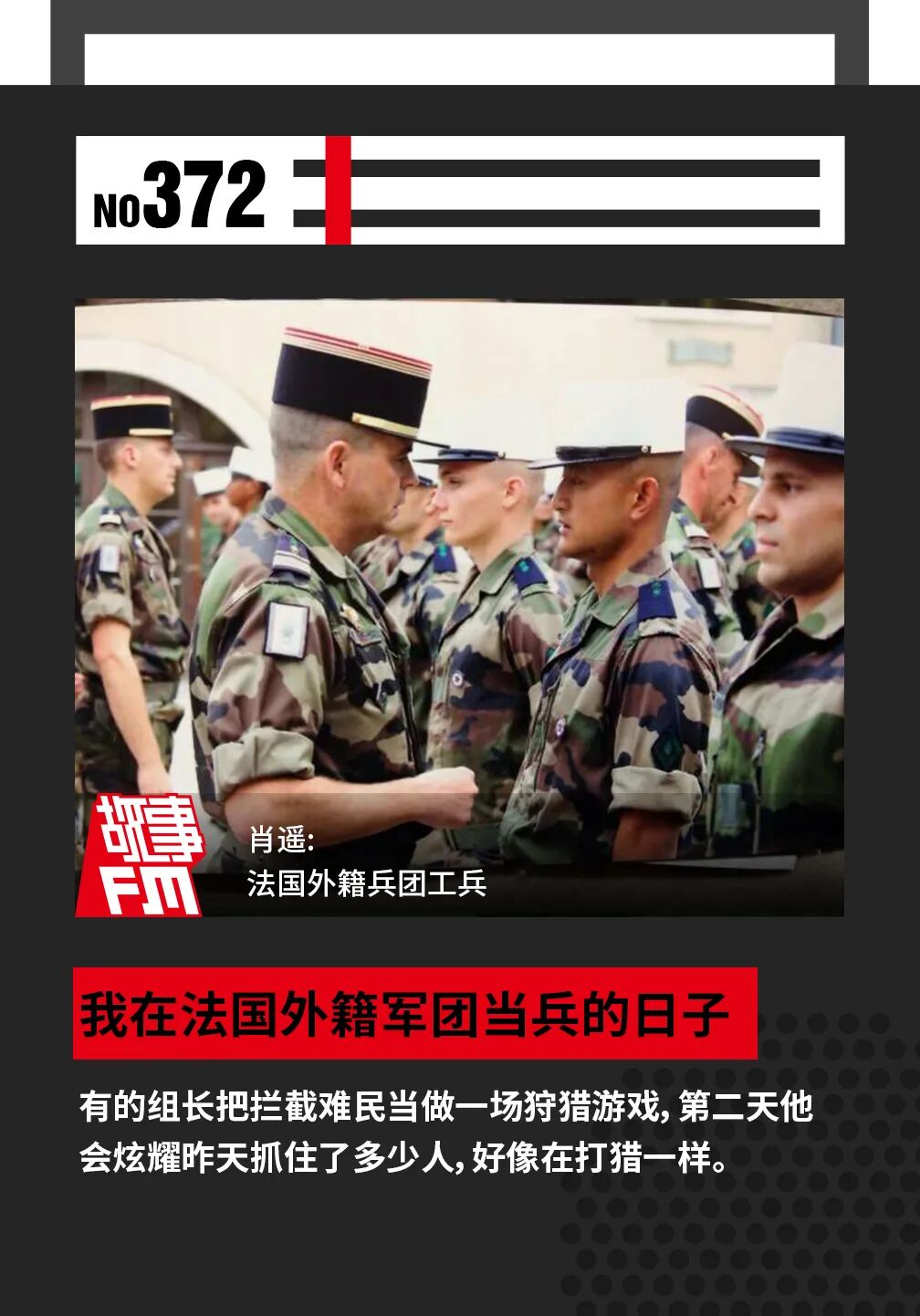 另一个人是偷渡出国,在国外已经打了好几年黑工,但一直没找到解决自己身份问题的办法。但是他在外籍军团工作满 5 年之后,就可以在法国居留或者拥有法国的国籍,所以他因为这个政策参加了军队。