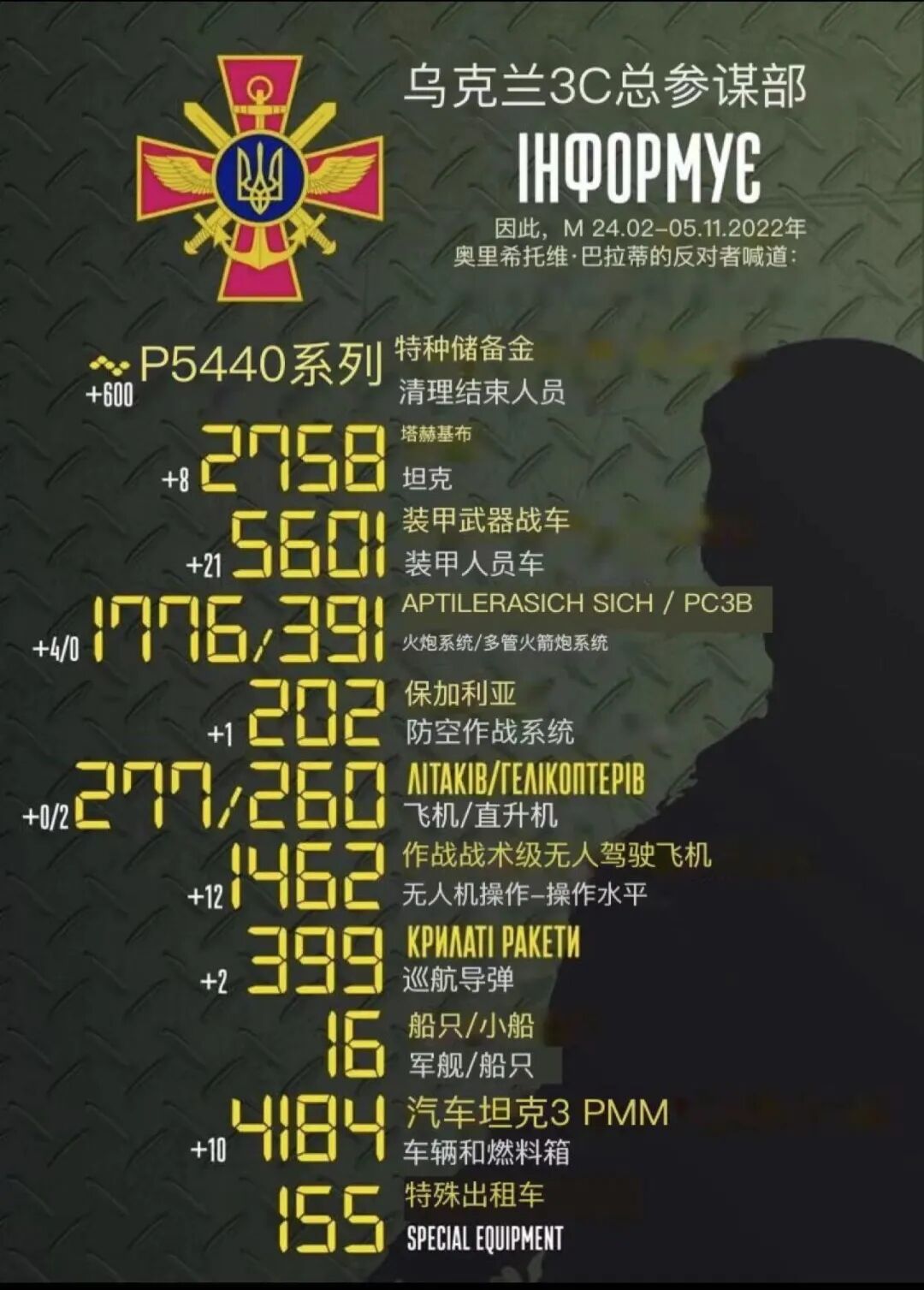 不知道是俄军的动员兵不经打,还是海马斯威力太大,总之,最近几天俄军的战损比较大,照这样打下去,刚动员来的那点新兵也不够打啊。难怪俄国又开始了秋季征兵。有很多新动员来的新兵,到前线没几天,就变成了炮灰。俄军已经被消灭75440人,这个数字有点大,战损按照1:3或者1:4来算,那可就是30多万人呢,也就是说俄军的30多万人已经消耗掉了,不得不在进行征兵了。| 03 |