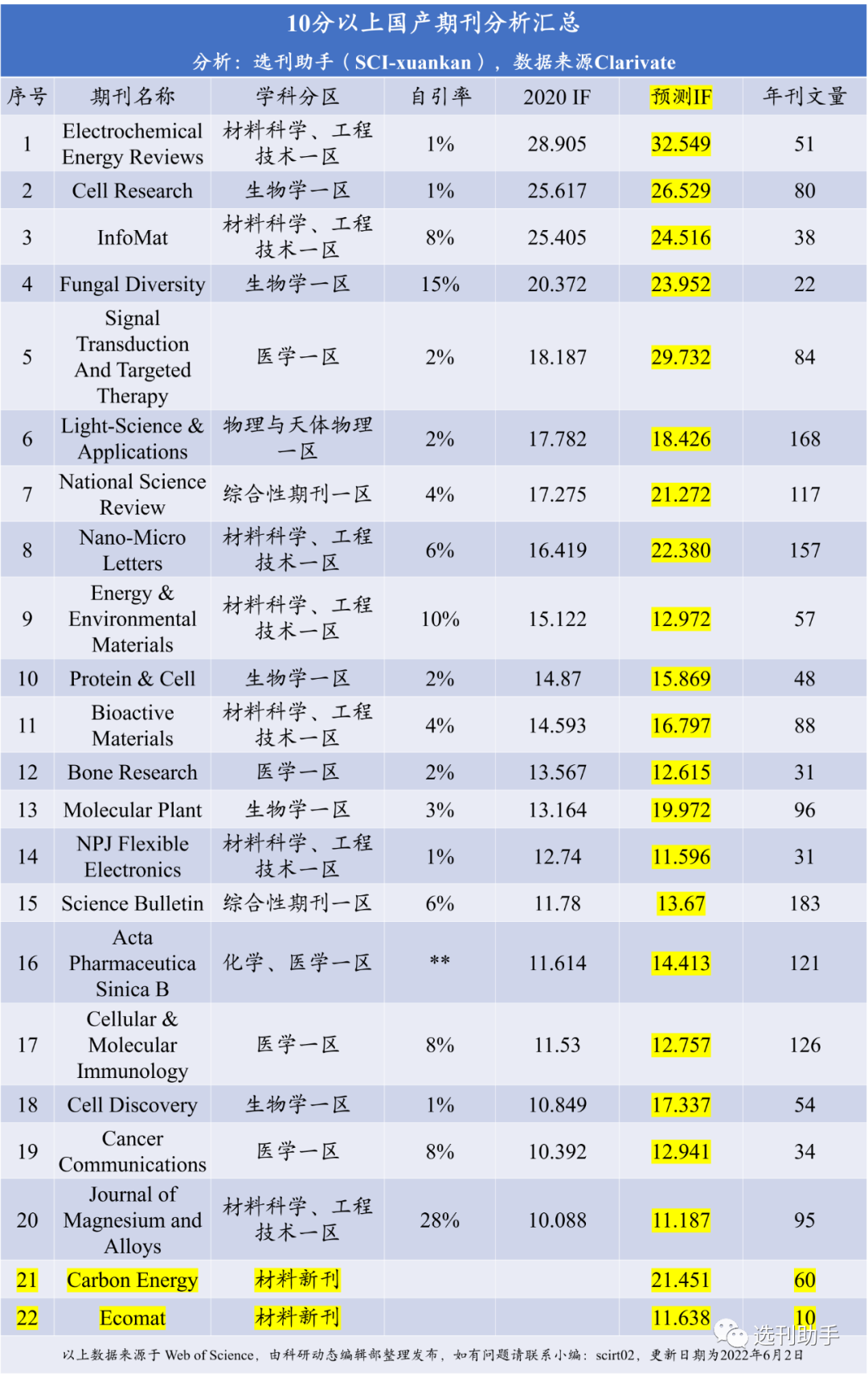 除了上述这些重点介绍的材料类的国产期刊,在化学、生物、医药、物理、冶金等领域,国产期刊质量同样节节高。在此,小编梳理了其他优秀的国产期刊,带大家大胆预测下新一年度的影响因子吧!
