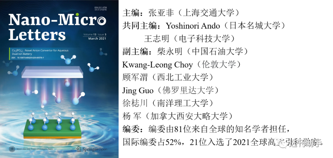 基本介绍:Nano-Micro Letters(《纳微快报(英文)》)是上海交通大学主办、Springer Nature合作出版的开放获取(Open Access)期刊。快速报道与纳米/微米尺度相关的高水平研究成果、综述、评论及展望等类型的文章。重点关注纳米、微米尺寸的材料与结构及其在能源、催化、环境、传感、吸波、生物医学等领域的应用研究。旨在引领纳微米科技前沿,搭建高端学术交流平台,促进相关学科创新发展,打造具有国际竞争力的优秀期刊。