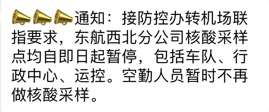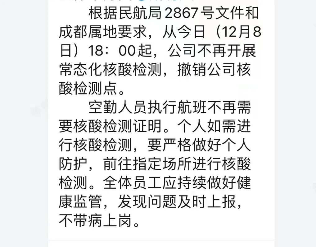 以南航为例,2022年12月7日18点53分,也就是“新十条”颁布后不久,南航广州对内发布通知,内容为:即刻起,调整防疫措施如下: