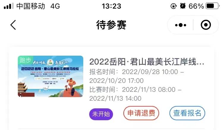 在赛事官方报名平台报名的取消报名程序如下图所示,在赛事报名页面,点击左下角主页→我的—待参赛—申请退费即可。官方平台报名的参赛跑者可在报名时间结束前(2022年10月20日17:00)取消报名和退款。报名时间结束后如无法参赛,报名费不予退还,不允许转让参赛名额。![]()