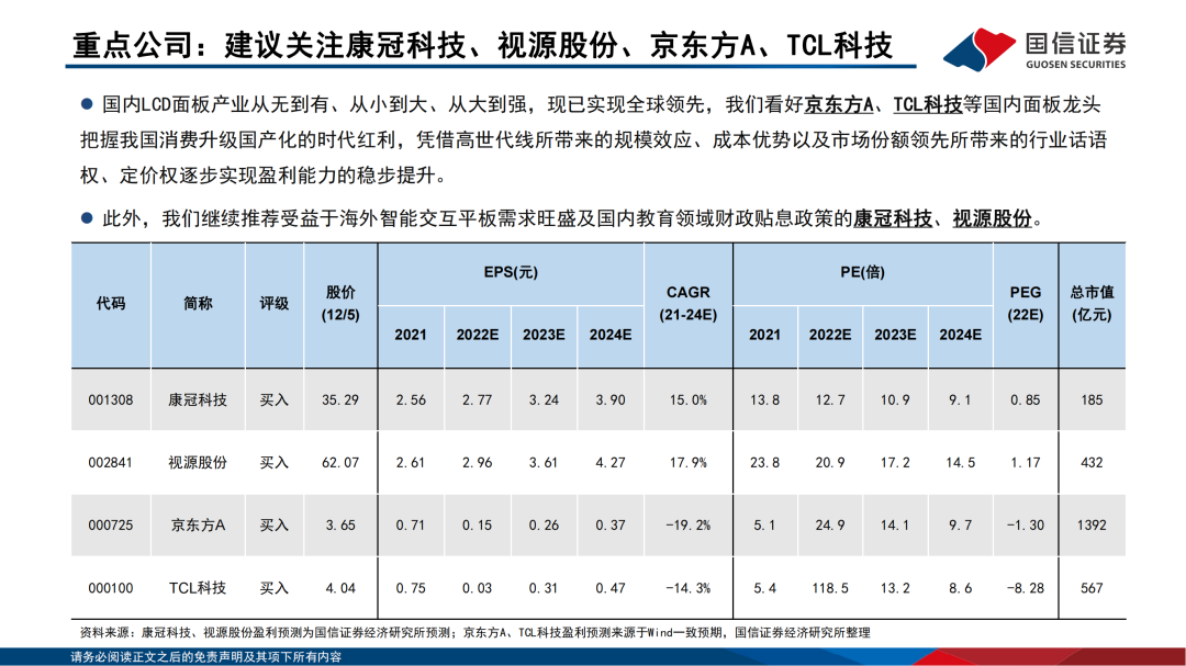 投资建议:LCD产业链建议关注康冠科技、视源股份、京东方A、TCL科技