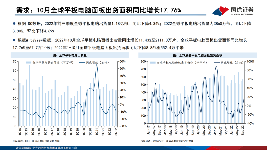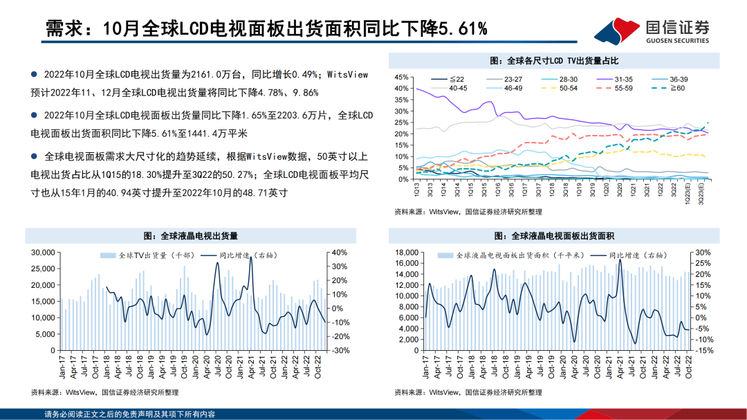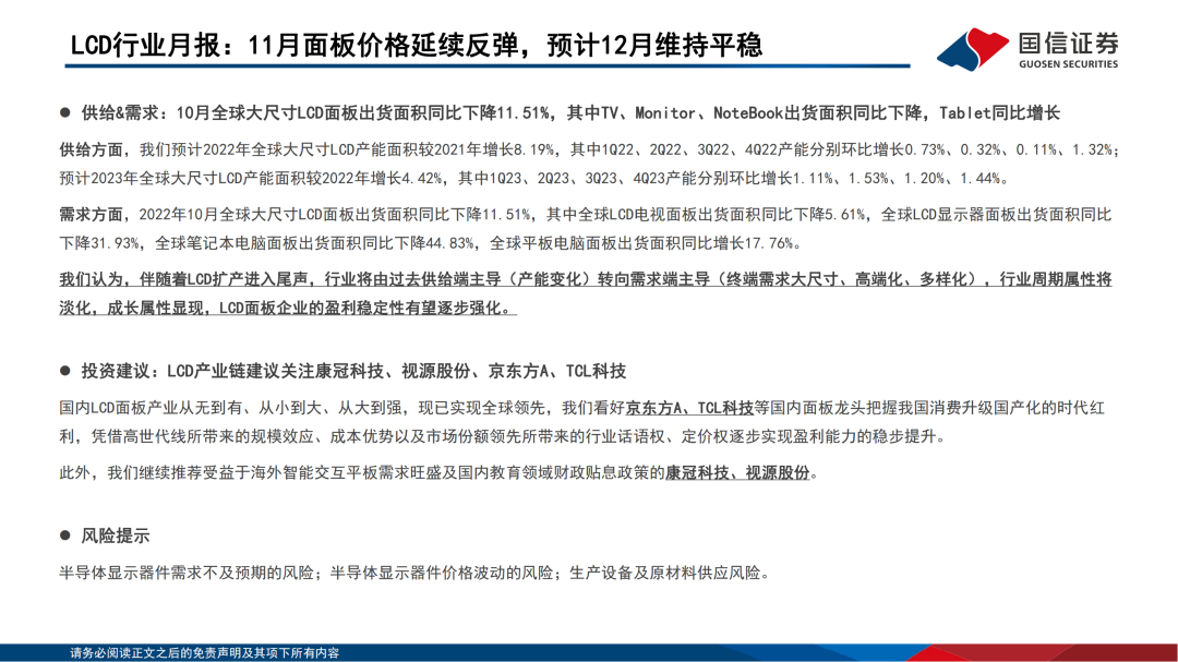 需求方面,2022年10月全球大尺寸LCD面板出货面积同比下降11.51%,其中全球LCD电视面板出货面积同比下降5.61%,全球LCD显示器面板出货面积同比下降31.93%,全球笔记本电脑面板出货面积同比下降44.83%,全球平板电脑面板出货面积同比增长17.76%。
