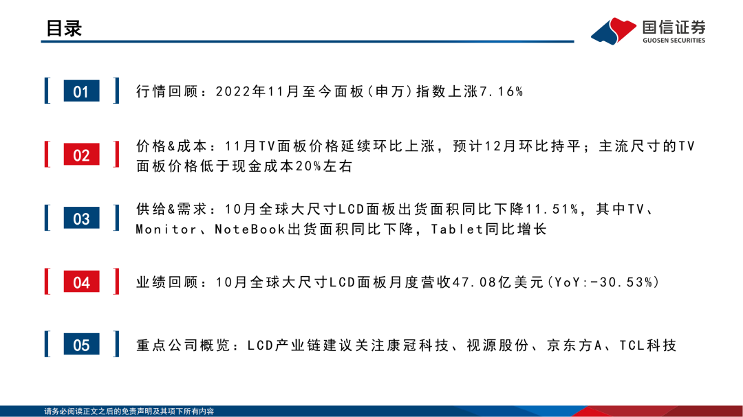 行情&业绩回顾:2022年11月至今面板(申万)指数上涨7.16%,10月国内主要LCD厂商大尺寸LCD业务营收均同比下滑