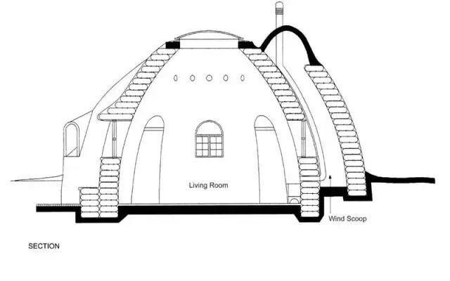 这种超级夯土建造的房屋,内部空间大约40平米, 由一个大的中央圆顶、四个小壁龛和一个风铲包围。