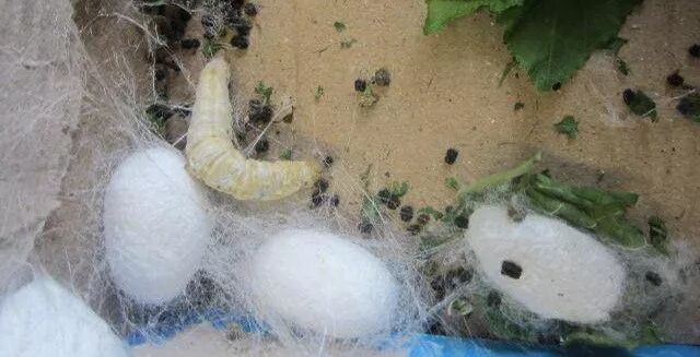 我们更忙碌了,三餐茶饭草草,打仗一般。张德容和李秀珍也十分紧张,每天清早提蚕,她俩都要从不同的匾里抓出三两只蚕,走到门口,举起蚕儿对着阳光仔细看。张德容说:“蚕子一生四眠五龄,到了五龄末期,就逐渐老熟了。这时候就要仔细观察,便于早做准备,不然到蚕儿吐丝了,手忙脚乱就不好。”蚕儿变老是有特征的,她俩教我们:先是排出的粪便由硬变软,颜色从墨绿转为叶绿色;然后蚕儿食欲减退,食桑量下降;消化管逐渐空虚,胸部呈现出透明。等到它们完全停食,腹部也透明起来,蚕儿就会昂头挺胸,口吐丝缕,左左右右,上上下下摆动着寻找草龙了。三十天过去,当我们熬红了双眼,精疲力尽的时候,蚕儿们终于浑身透亮,不再吃桑叶,爬上了乡亲们为它们打好的草龙,安安静静地作茧自缚了。![]()