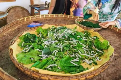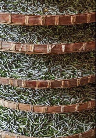 我们去的时候,蚕儿只有两分,十几匾就装了。拿桑叶在匾里铺上厚厚一层,估摸够它们吃上一阵子,我们便提着篮子去采桑叶。田野里麦穗在灌浆,桑树已成绿荫,开出了一串串黄绿的桑花,飘荡出阵阵清甜的香味儿。把自己想象成美丽的采桑女,在田边地角闲逛一会儿,四处一片静悄悄,菜花丛中蝶飞蜂舞,却不见有人张望,只好采得桑叶恹恹而归。好景不长。那蚕宝宝吃了睡,睡了吃,每时每刻都在长,一天一个样。清晨睁开眼睛,我们就要忙着提蚕。提蚕,其实就是清扫蚕沙,分装蚕儿。把装满蚕子的竹匾端来放在木架上,把蚕网从竹匾里提出来,放在另一个竹匾里,再倒掉匾里的蚕沙。这时候,可以清晰地看见蚕儿灰白身体的接节,它们紧紧地附着在蚕网上,已经比昨天又长大了许多。我们要把蚕虫抓起来,铺上蚕网,把它们分装到两三个竹匾中。我从小怕虫,刚开始,根本不敢伸手去抓蚕儿。看着这些蠕动的蚕,这才知道,做个养蚕女,不只有“桂枝系笼钩”的浪漫,还需要有点英雄气概。鼓起勇气抓了第一次以后,就再也不怕了,触摸到它们,反而有一种冰冰凉凉的感觉。分好蚕儿,铺上厚厚的一层桑叶,把每个竹匾端到蚕架,一层一层地塞进去。所有的蚕儿提完,喂完,已接近晌午,我们才能回家吃早饭。蚕儿长得越大,我们的工作就越繁重。到了后来,起初沾满了蚕卵的几张蚕纸,两眠三眠以后,长成的蚕儿竟堆满了几间蚕房。生产队早就另外派人去采摘桑叶了,采桑人不断地背来桑叶,我们就生活在蚕架和桑叶之间。每天不断重复提蚕、喂蚕、准备桑叶,生活单调而劳碌。幸好有几个采桑女,她们每天几趟,背来桑叶,说东家,道西家,诉说农事,给我们带来许多蚕房外面的讯息。4: