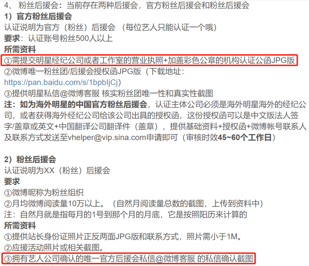 根据微博平台认证规则,这些粉丝后援会都至少具有艺人公司确认的唯一官方后援会私信确认截图,或明星经纪公司/工作室的营业执照及加盖彩色公章的机构认证公函。在粉丝数排名前20的后援会账号里,只有蔡徐坤粉丝后援会并非是以蓝V,而是以超话主持人金V个人身份获得认证。