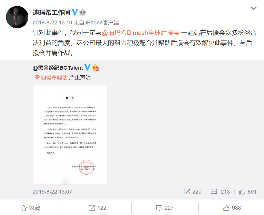 在内地,一个较为成熟或者热度较高的艺人,可能具有官方后援会、粉丝个站和其他大大小小的资源博、数据博、打投组等分支。其中,体系化的官方后援会有着显著的优势,往往作为唯一对接公司的粉丝站,能够集中力量办大事,集资、轮博、做数据都更集中。艺人的官方后援会,往往有微博蓝V认证,这在平台侧意味着是以企业或机构身份进行认证。