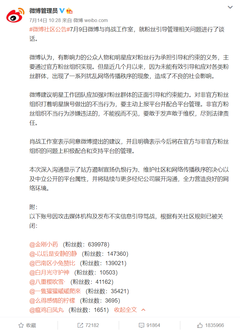 7月14日,微博管理员账号也发布了一则社区公告,称微博已与肖战工作室在7月9日就粉丝引导管理相关问题进行了谈话。一周过去,天津网信办、河北网信办陆续启动了专项整治行动,管控无底线追星、饭圈互撕等现象,旨在为青少年树立一个良好的榜样。