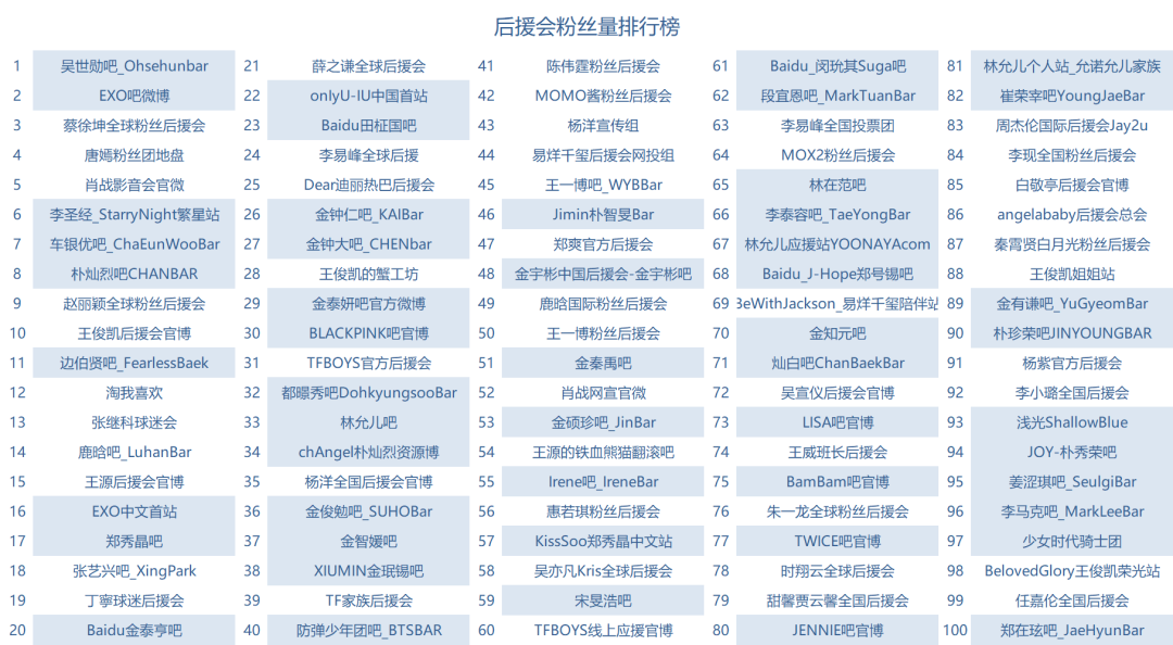 在头部后援会当中,粉丝量排名前100的账号,更是能反映出当下内地饭圈的分布状态:排名前10的后援会里,对应明星分别为吴世勋、EXO、蔡徐坤、唐嫣、肖战、李圣经、车银优、朴灿烈、赵丽颖、王俊凯,都是具有高人气的当红偶像。截至7月16日,第一位的@吴世勋吧_Ohsehunbar的粉丝数达到435万、而第十名@王俊凯后援会官博则为238万,前者几乎是后者的两倍。