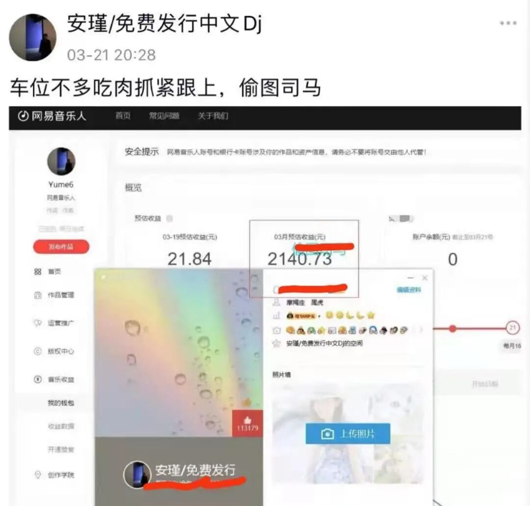 而另一张截图中,一家名为“星曦文化”的商家通过刷量,一个账号一个月的收益在1000多元到2000多元不等。除了日常播放分成,一些由音乐平台发起的原创音乐激励活动因为更高的分成比例,也成了不法之徒薅羊毛的重点。