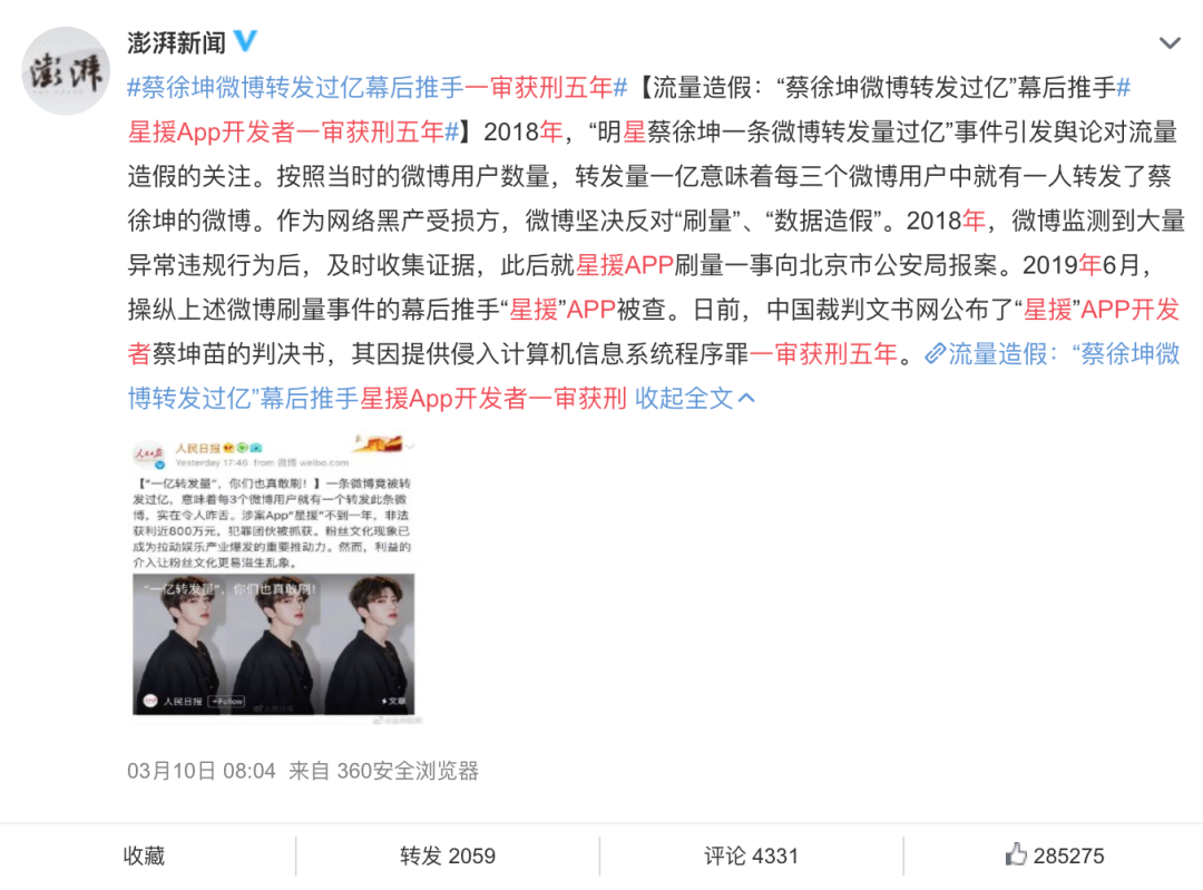 前阵子,2019年因曾经帮助蔡徐坤制造一亿微博转发量的幕后推手星援APP被查封,其创始人蔡坤苗也被判5年刑期。蔡坤苗提到,“2019年2月份查看后台数据,星援、应援宝共有微博‘大号’用户17余万个