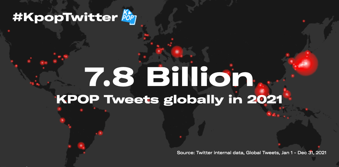 受益于全球数字化,K-pop粉丝在海外新媒体平台上蓬勃发展。数据显示,#KpopTwitter在2021年产生了78亿条全球推文,打破了2020年67亿条推文的纪录,全球推文量显著增长了 16%,且对音乐以外的韩国娱乐兴趣日益浓厚。