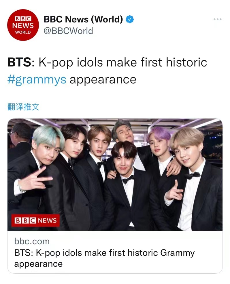 在美国知名音乐杂志《Billboard》发布的衡量艺人在全球社交网络中受欢迎程度的 “Social 50 ”榜单中,防弹少年团已经连续多年占据第一。根据国际唱片业协会(IFPI)发布的《全球音乐报告》,BTS连续两年在“IFPI全球艺人榜”中获得冠军,并且凭借2020年的热门单曲《Dynamite》首次获得了格莱美最佳流行组合奖项的提名,成为第一个真正打入欧美本土市场的组合。
