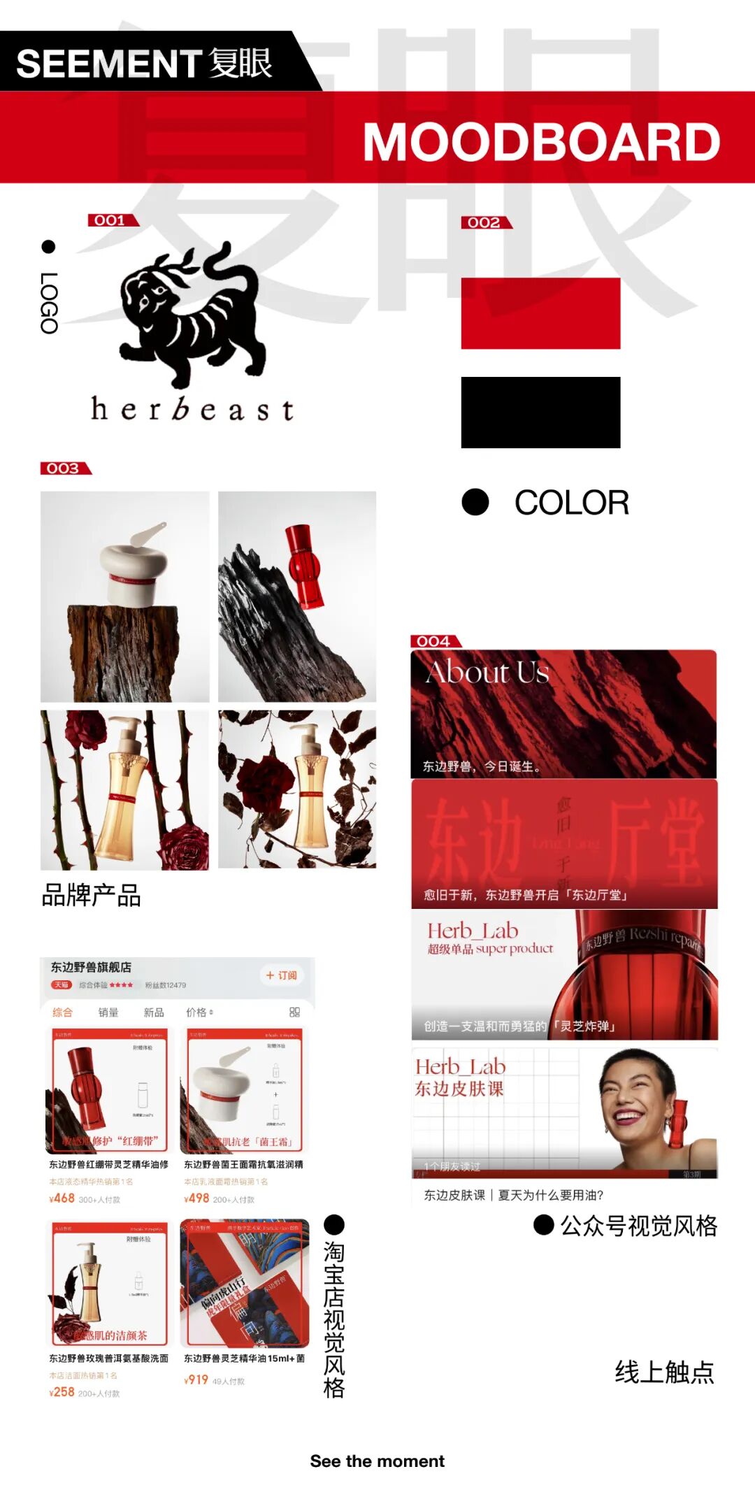 当下,消费品总要以强烈的视觉记忆点来抢占用户注意力,而东边野兽则是选择视觉冲击力极强的红色。红色,本身具有性格优势,即代表着坚强、热情,并且在中国传统中红色具有很强的文化属性,十分符合东边野兽的调性,但如何将红色运用的高级不会让人感到”土”是很关键的。
