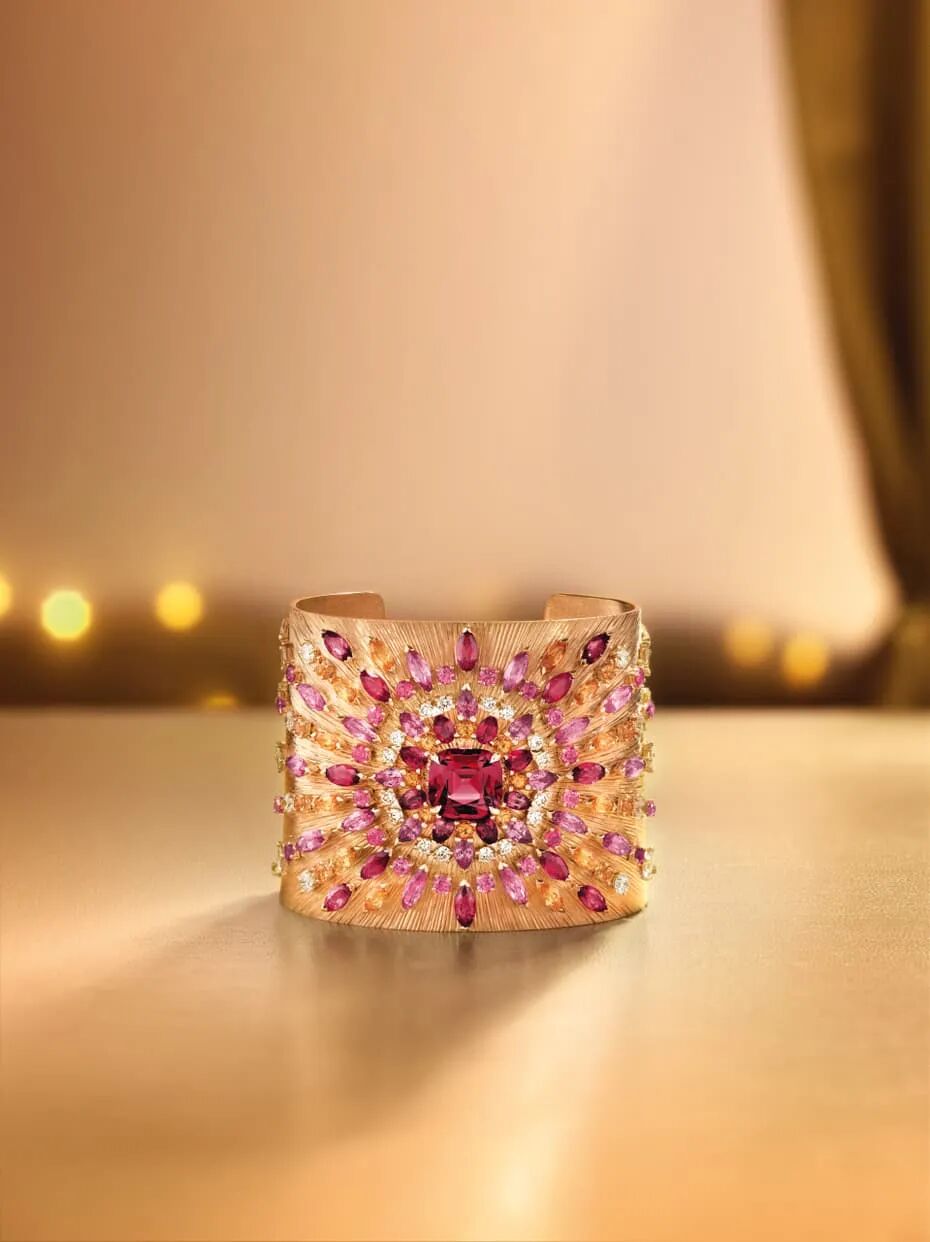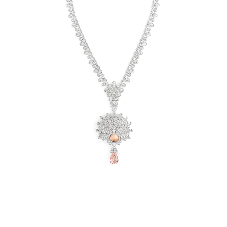 这个系列的特色是将尚美的工艺与异国风情结合在一起,而Cindy Bruna的一套珠宝,灵感来源是俄罗斯西伯利亚冬日雪景,看起来也很像冬日飘下来的雪花。其中粉橙色的宝石是帕帕拉夏刚玉。