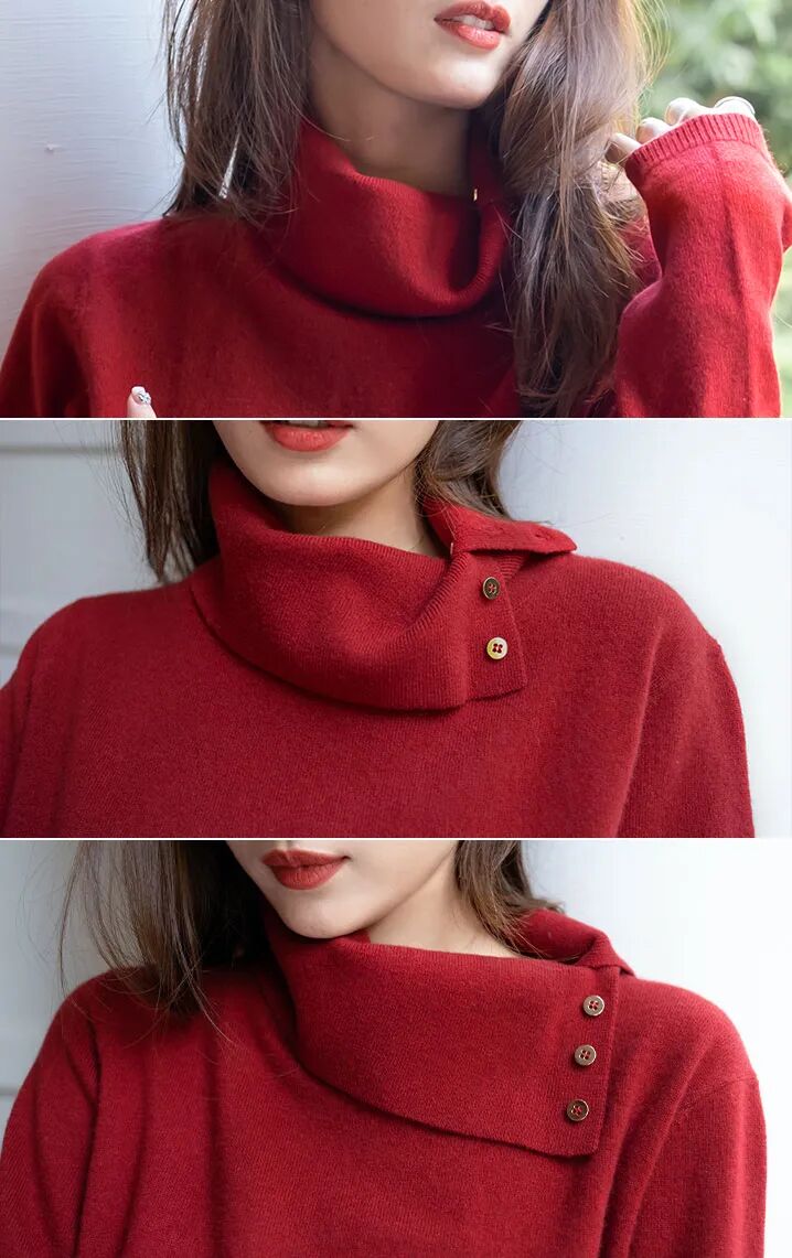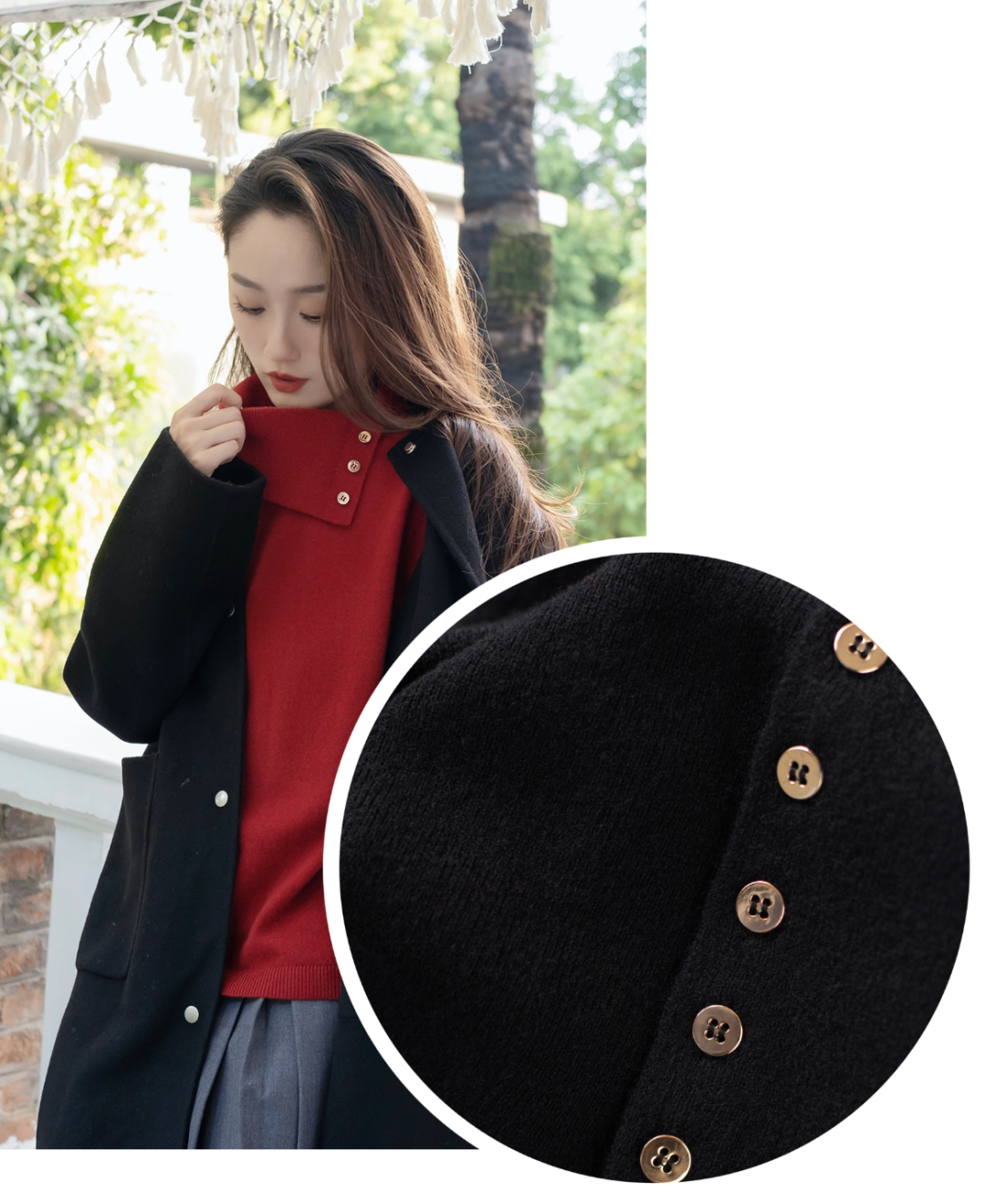 除了穿起来好看,它当然必须满足我室内室外随时切换搭配的需求,无论任何场合、任何时候穿上都是适宜妥帖的,还有,要显瘦。冬天穿了件不适合整体露出的内搭,进了室内后,无论热气开得有多足,额角上是不是都沁出了汗也无所谓,反正死都不肯脱外套,这样全天下只有自己一个人知道衣服里面穿了啥(黄小姐听说这段儿后为此笑了我许久)。这种窘迫当然是记忆犹新,以至于之后每次买衣服前我都会再三考虑,如果做内搭这件衣服是不是有亮点,单穿会不会百搭。毕竟有太多内搭单看实在寡淡如秋衣,它们的全部存在价值就集中于那些做搭配时露出来的边边角角……所以,当初设计这件毛衣的时候,这个最最明显的“一排金扣”高领,就是想给所有担心高领毛衣穿着丑的姑娘们一个极大的安全感。一来是每个人的脖子长度不一样,同一件贴脖子的全高领,有的人穿起来领口刚好到下巴,显得很挺括,可换其他人穿,松垮的领子就全团在脖子里,翻下来不够拉上去又太长,简直进退两难。但做成可调节的纽扣,就方便了很多。5颗金扣子,想要什么高度都能随心控制。歪个楼,这个扣子大家也很熟悉,是我们去年做开衫用的定制小金扣。这次用了回来,我依然是怎么看都觉得天呐这个浅浅的米金色扣子简直是太好了!不会拉坠领口,穿着看着特别平整美观;也不会抢了整件衣服的优雅,影响造型的简练程度,非常高级。买过的姑娘们应该都知道这排品质感优秀的小金扣有多漂亮,配黑色复古、配虞美人红大气,作为一个装饰点,它能够让各种轮廓简练看上去“平平无奇”的衣服,焕然一新。二来,领口的纽扣设计,让整个领子的形状也可以随意调整: