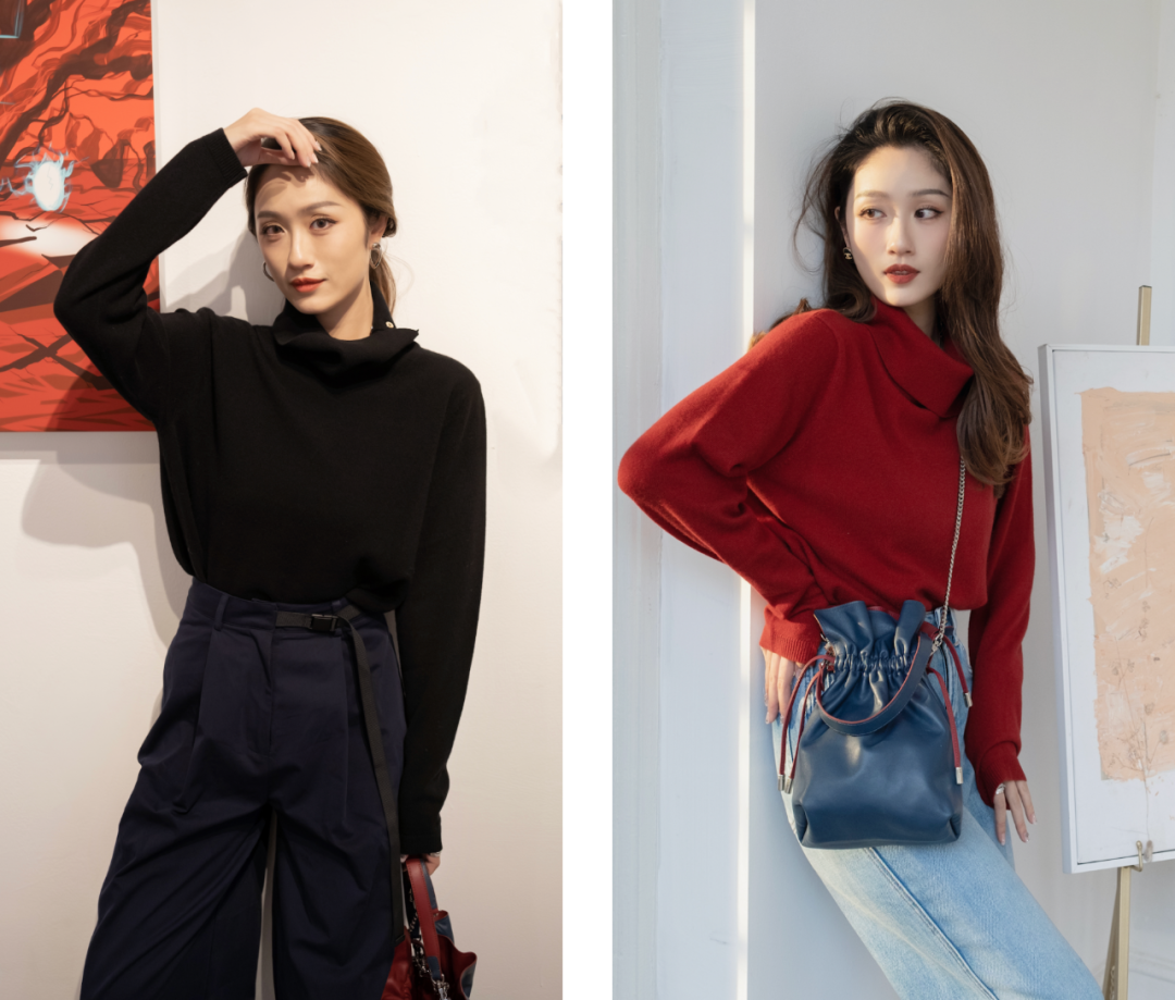 市面上那些包裹感好的高领毛衣,显然是给瘦子们准备的,没错是可以跟衬衣叠穿呀,可以搭配项链呀,但是!不能只看模特的穿着效果呀,我这种脖子不长,人也有可观厚度的,咋可能穿起来好看?我们去年也做了一款半高领的羊毛羊绒衫,考虑的就是同样的问题,要显脖子长,要显脸小,要穿着舒适没有束缚感。今年的这件高领同样无一例外,完全做到。