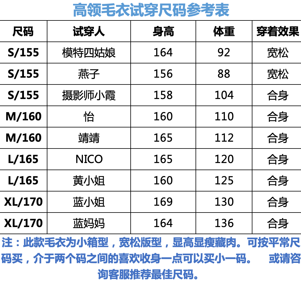 衣服嘛,只要拥有自己的轮廓它就不会凸显穿着者的身材小缺陷。买过我们家各类箱型衣服的姑娘们都懂,这个版型完全不挑人,身材包容度很高。单穿足够利索的,作为内搭的时候也不会有臃肿的效果。另外,衣长没有做很长。穿起来下摆不会过臀线,完全不用担心会拖累比例。做内搭掖进下装里也很方便,不会一大坨鼓鼓囊囊的塞在小肚子的位置。*这里要拖出黄小姐来示范了,确实裙子掖进毛衣里都不太显得出来,优秀。也建议大家尽量不要穿太宽松拖沓的,选合身码数反倒最显利落(拿不准的建议咨询我们的客服小姐姐)。就我们号的身材来说,从非常瘦而娇小到中等的梨形苹果型标准型微胖型和高而胖(就是我本人)都有,经过多次检测,这件毛衣是大多数身材都能穿好看的。衣袖的位置并没有做得很收紧,再加上肩颈部位的结构,整个肩膀会看起来很平直。而且从图片里也能看出,袖长是比大家平时的毛衣要做得稍长的。这点既是为了和高领口呼应,也是一个显瘦的小心机,会显得四肢很纤长,比例优越。拉下来可以盖住大半只手的长度。而且越往袖口处,也做了一个微微带点收紧的锥形,既不会因为长度显得啰嗦,还可以方便卷上去堆叠在手臂处增加层次感。
