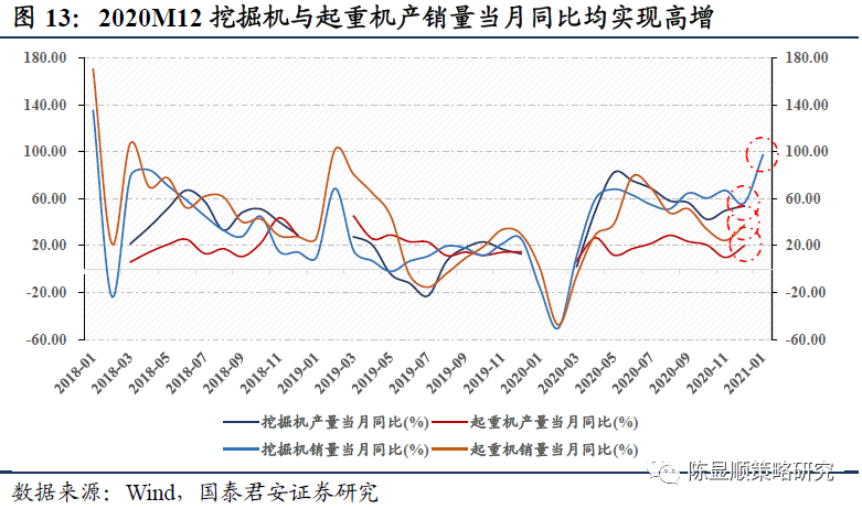 ▶ 下游周转抬升带动中观需求释放。(1)机械:资源品后是机械制造之春。需求+供给+金融条件宽松下企业资本开支将进入上行通道,地产施工主要涉及的挖掘机与起重机品种,2020M12产销量当月同比均实现高增,2021M1挖掘机销量更是增长97.2%,彰显下游强劲动能;(2)建材:地产链弹性集中于施工及竣工端。节后下游工地密集复工复产,暖冬+部分农民工就地过年令需求启动较以往正常年份提早约半个月。同时2021M3订单逐渐清晰,市场有望正式进入2021Q1财报的博弈。目前来看弹性排序大约为玻璃、玻纤>消费建材>水泥;(3)建筑:基建不亮地产亮。2021年的投资,制造业>房地产>基建已是市场共识,但地产成交火爆所孕育的装配式,尤其是钢结构及装修类机会或超预期,住宅是在手订单高增的主要贡献;(4)轻工:地产回暖再打一剂强心针。随着住宅销售面积/金额的同比转正、竣工面积增速的降幅收窄,家具2020Q4业绩预告捷报频传。