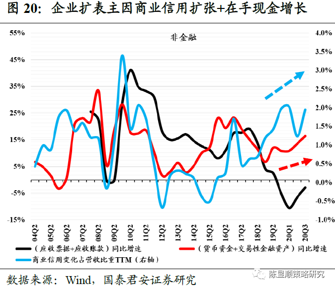 资产负债表视角而言,过往信贷宽松期往往对应企业债务的迅速增长。而本轮宏观杠杆率提升背景下,企业资产端扩张主要由在手现金增长、商业信用扩张(对非上市企业资金占用增加)、存货累积(同比正增但速度持续下降)三项贡献,此外,从负债端来看,反而由于偿债意愿较高,短期债务持续消化。因此,本轮更多由内生增长(商业信用和现金)贡献的企业扩表行为,在未来信用收缩背景下,将更加具备持续性。