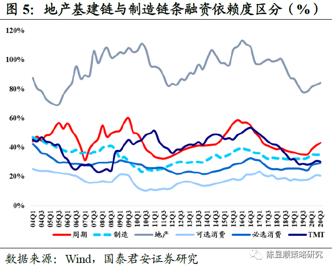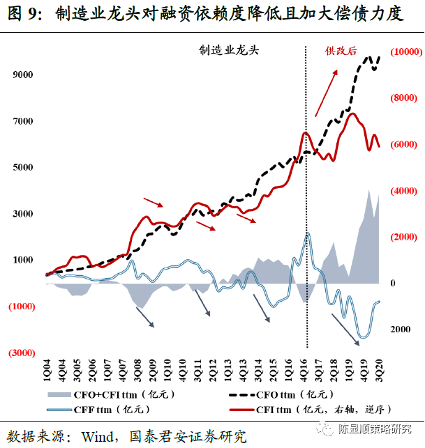 一方面,疫情应对下过往以加大基建、地产投资为主导的传统逆周期政策的低于预期,预示了本轮反映实体经济真实需求的制造业受政策支持力度明显较强,而制造业部门融资依赖度相对较低。另一方面,从微观结构上来看,疫情冲击推动行业内部出清节奏的二次提速,以及前期去杠杆环境下制造业龙头公司率先开启的报表修复加速,为本轮企业凭借内生增长抵御信用条件的边际收缩提供了良好的实施条件和土壤。
