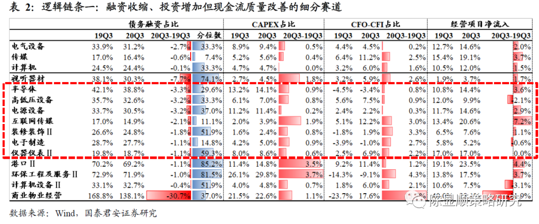 当前时点,着眼于信用收缩效应下行业层面的应对及隐含的结构性机会,我们根据财报数据,基于“投融资共振”、“现金质量提升”、“高景气拉动”三条逻辑进行细分赛道筛选: