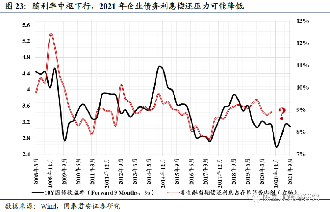 3、我们通过构建当期债务利息偿还比例指标来衡量企业未来的“付息压力”,随利率中枢的下降2021年有望减弱。