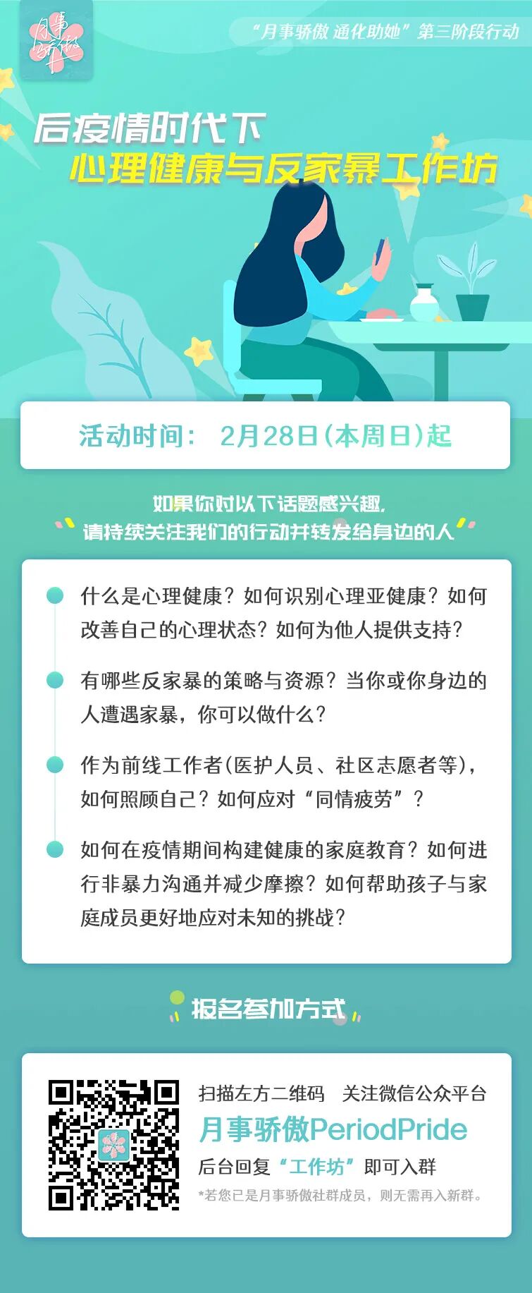 自2月28日(本周日)起,月事骄傲将举办系列主题线上工作坊,将邀请相关的研究者与行动者们进行知识普及,改善生理与心理健康,保障女性与儿童、前线工作人员、社区家庭、脆弱人群等群体的基本权益。