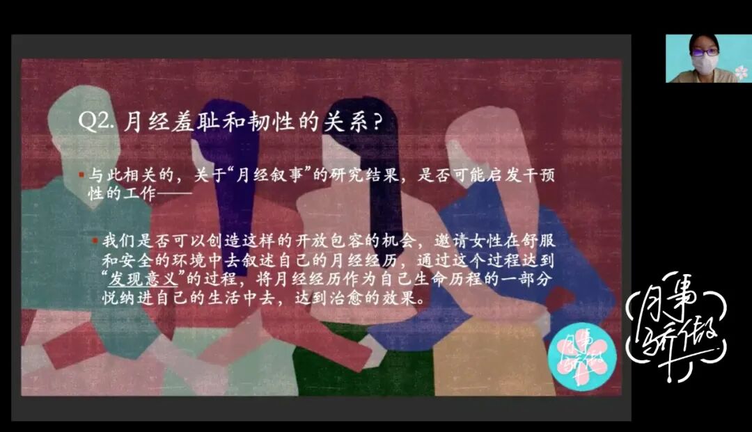 Tiffany为大家介绍了针对月经和心理健康的研究计划的三大研究问题:月经羞耻和心理健康有什么关系?月经羞耻和韧性有什么关系?月经羞耻是否能被克服?根据现有的研究 (Sveinsdóttir, 2018),我们知道,月经羞耻和生活质量有负面的关系。月经羞耻,和身体羞耻、性羞耻相关,因为这些话题的社会“禁忌”性质,所以人们很少有机会去讨论、去讲述。心理学上,我们如何对我们的人生故事进行叙述和解读,其实和我们的心理健康也非常相关 (McLean et al., 2020)。也因此,月经叙事可以是一块研究的蓝海,相关的研究结果可能会启发相关的干预性工作,通过给女性(或其他的月经经历者)提供安全的环境,鼓励TA们在讲述的过程中发现意义、达到治愈的效果。与此相关地,近几十年来,越来越多的学者开始探索认知行为疗法第三浪潮所推崇的概念(关注当下、非批判性、接纳和关爱)对于心理健康的影响,其中包括对于改善女性的自我关怀和减缓对于自己身体的不满的效果 (Albertson et al., 2014);相关的干预手段也有机会被运用到对于改善月经羞耻的行动中。这里,我们引用了一些相关的文献,感兴趣的小伙伴可以顺藤摸瓜,从这些文献入手深入了解月经羞耻和心理学。但是,Tiffany从心理学角度讨论了关于这三个问题的学术研究成果相对缺失,因此具有较大的研究空间。