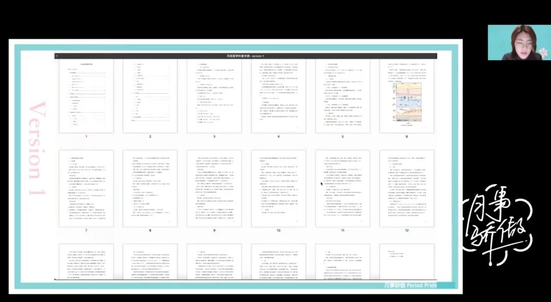 cc为大家介绍了小组所做的第一版月经医学科普手册。手册依次介绍了月经及其相关概念,月经的成因,月经的正常生理现象,月经异常及相关不良症状,月经注意事项以及国内月经研究现状。手册内容非常详尽,从如何判断月经出血量多少到哪些食物会对月经产生影响,都有细致的讲解;医学科普组也在研究过程中发现国内月经研究的对象目前只局限于生理性别为女性的群体,而针对非二元性别女性、性少数和残疾群体的学术研究远远不足,这些都是之后需要发展的方向。