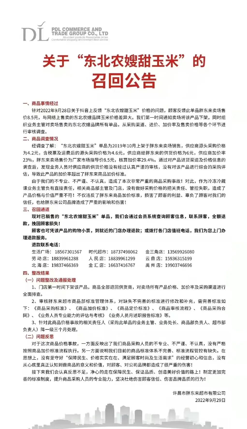视频发出次日,胖东来就发布了关于“东北农嫂甜玉米”的召回公告。公告显示,“东北农嫂甜玉米”供应商源头采购价格为4.2元,含税票及运费后的源头采购价格为4.6元,供应商给胖东来的供货价格为6元,供应商加价率23%,胖东来卖场售价为厂家市场指导价8.5元,核算加价率29.4%。